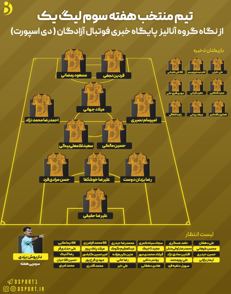 به گزارش”فوتبال آزادگان”؛ گروه آنالیز تحریریه پایگاه خبری فوتبال آزادگان (دیاسپورت) پس از بررسی و آنالیز فنی هر یک از مسابقات هفته هفتم رقابتهای لیگ یک باشگاههای کشور؛ ترکیب بازیکنان اصلی، ذخیره و لیست انتظار تیم منتخب این هفته از رقابتها را به شرح زیر اعلام کردند